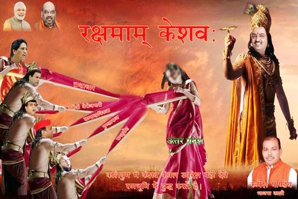 दरअसल इस पोस्टर में यूपी को द्रौपदी और अखिलेश यादव, मायावती, राहुल गांधी, आजम खां और ओवैसी को दुशासन (कौरवों के रूप में दिखाया गया है।)